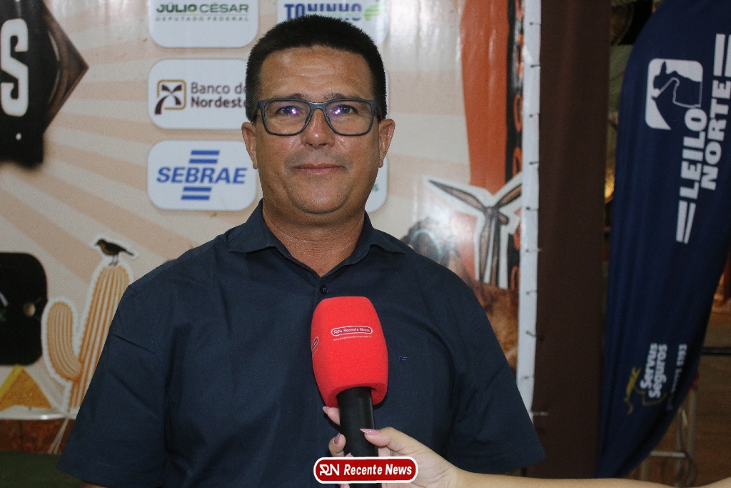 O secretário Marcos Aurélio falou sobre os avanços do setor agropecuário no município, o apoio direto da pasta aos produtores e a relevância técnica da feira para capacitação e incentivo aos pequenos e médios criadores.