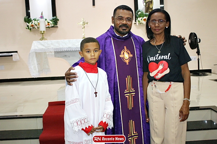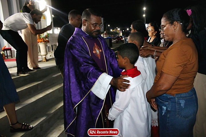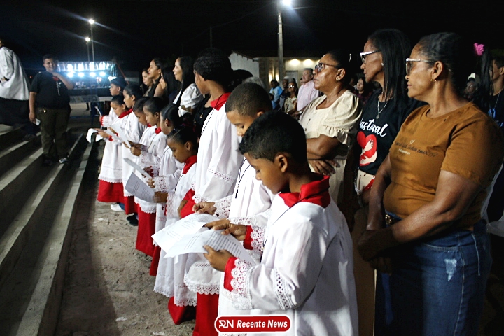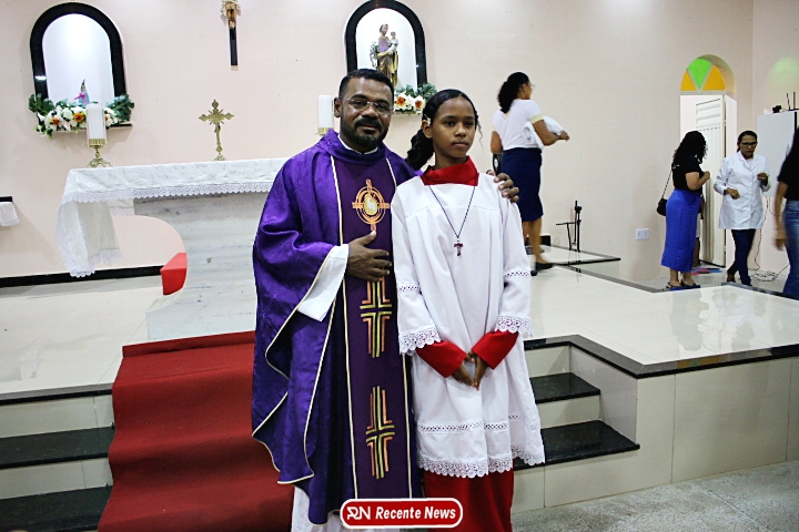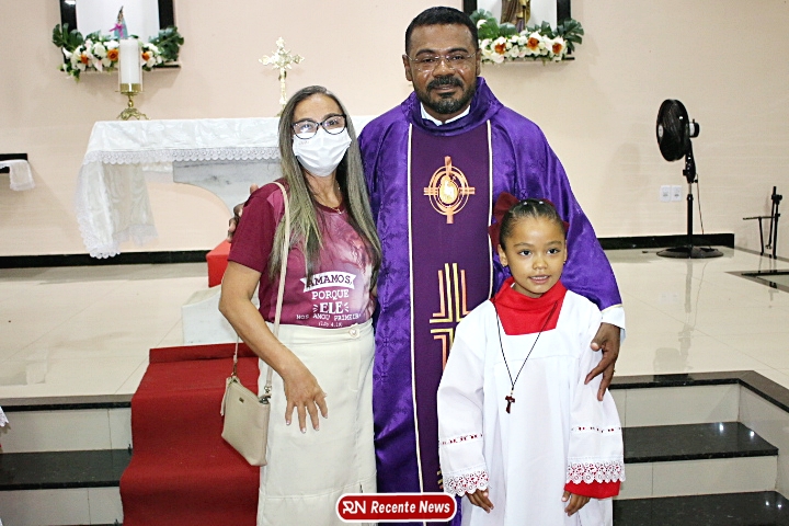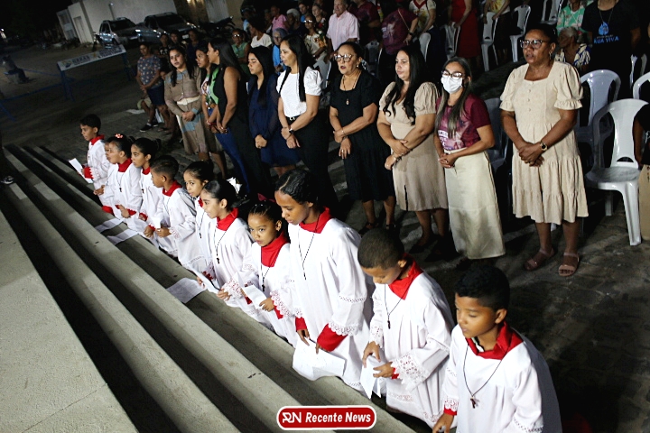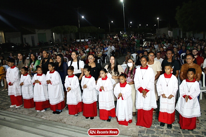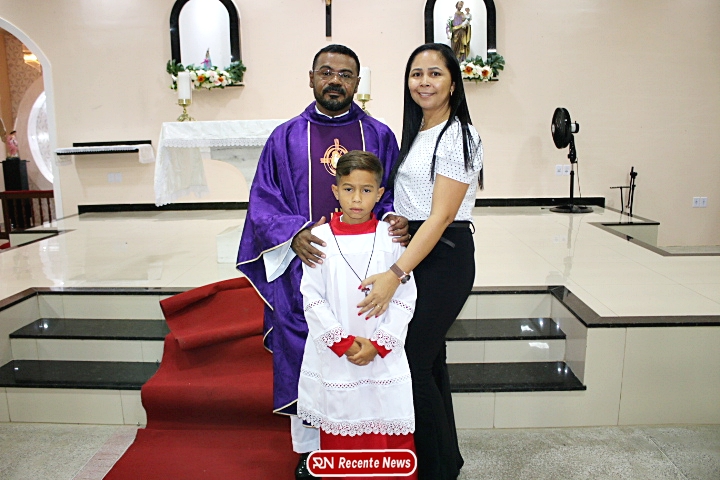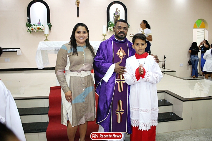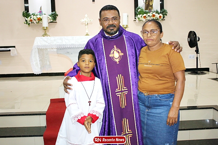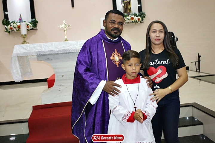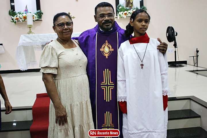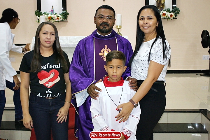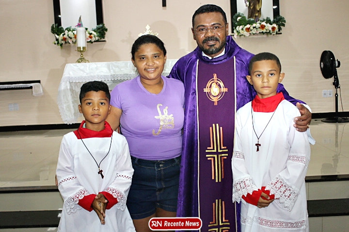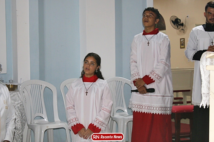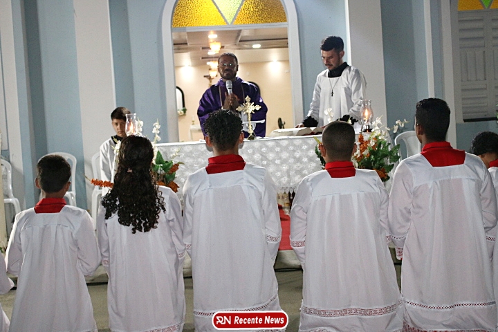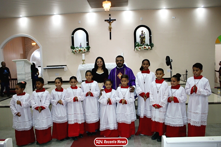 Um dos momentos mais especiais da celebração foi a investidura dos novos coroinhas, que receberam suas vestes e foram apresentados à comunidade. A cerimônia emocionou pais, familiares e os próprios jovens, que agora passam a exercer o serviço litúrgico com dedicação e responsabilidade dentro da igreja.