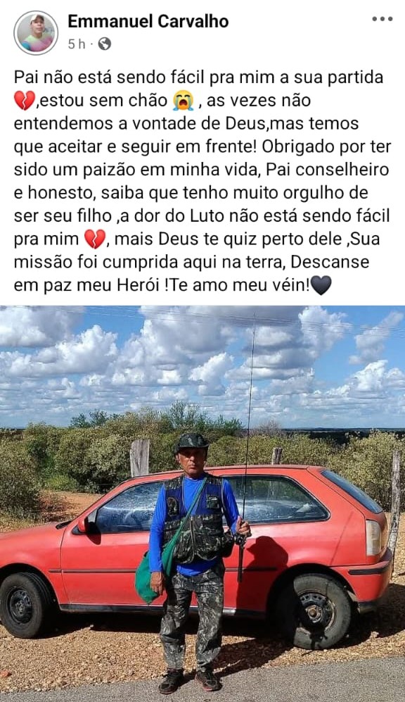 “Pai não está sendo fácil pra mim a sua partida 💔, estou sem chão 😭, às vezes não entendemos a vontade de Deus, mas temos que aceitar e seguir em frente! Obrigado por ter sido um paizão em minha vida, pai conselheiro e honesto. Saiba que tenho muito orgulho de ser seu filho. A dor do luto não está sendo fácil pra mim 💔, mas Deus te quis perto dele. Sua missão foi cumprida aqui na terra. Descanse em paz meu herói! Te amo meu véin! 🖤”