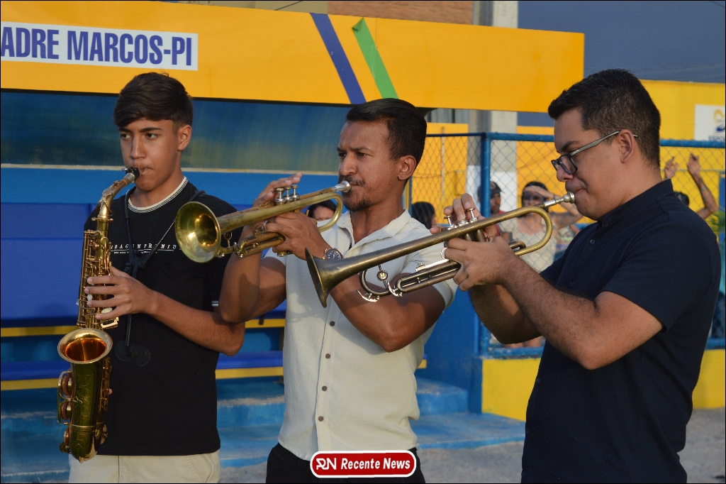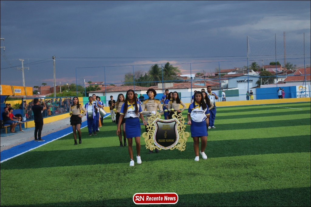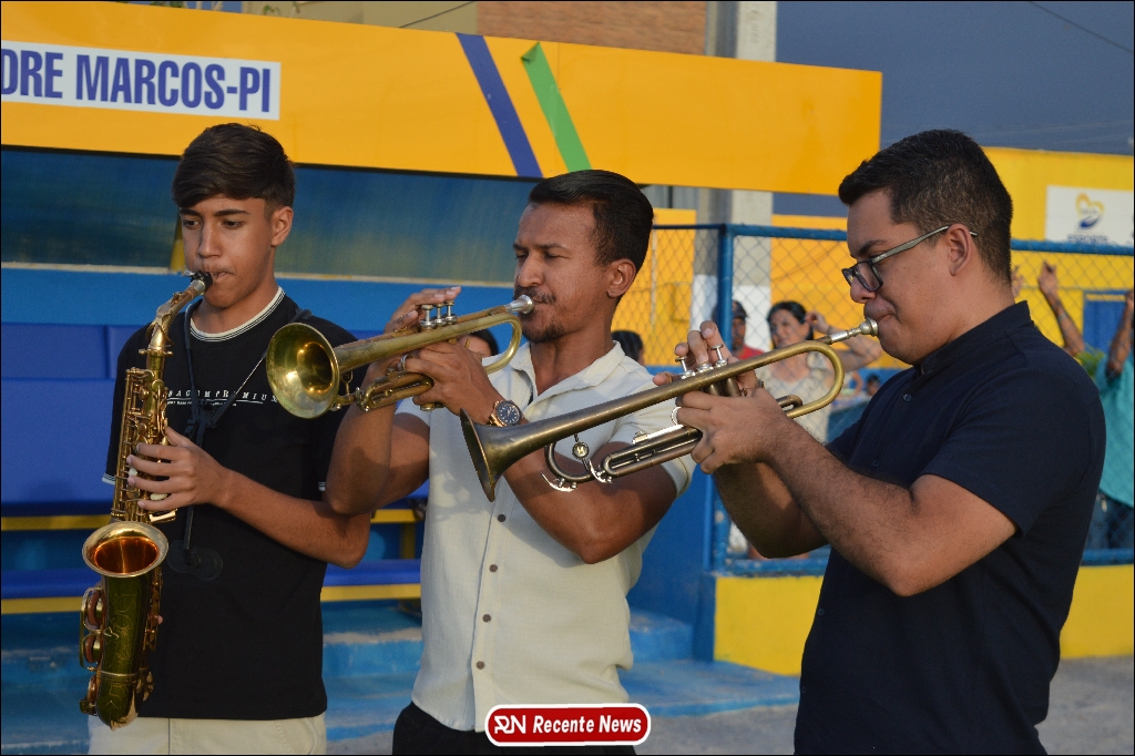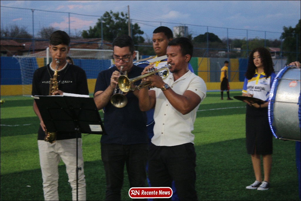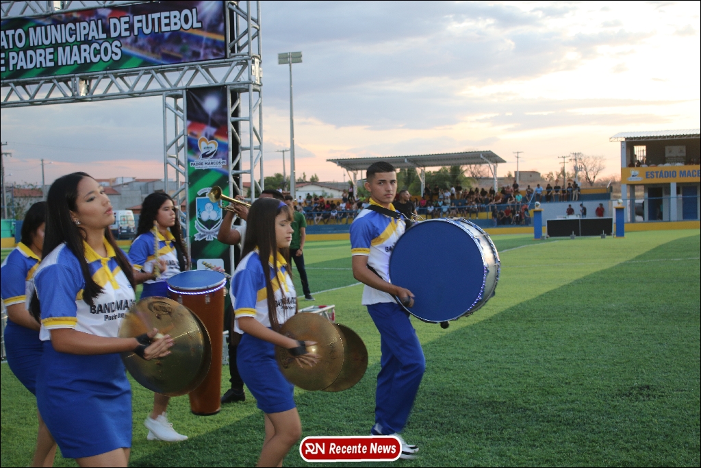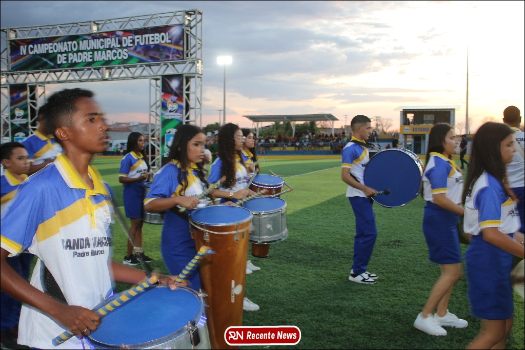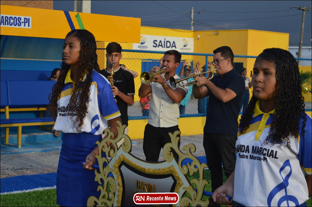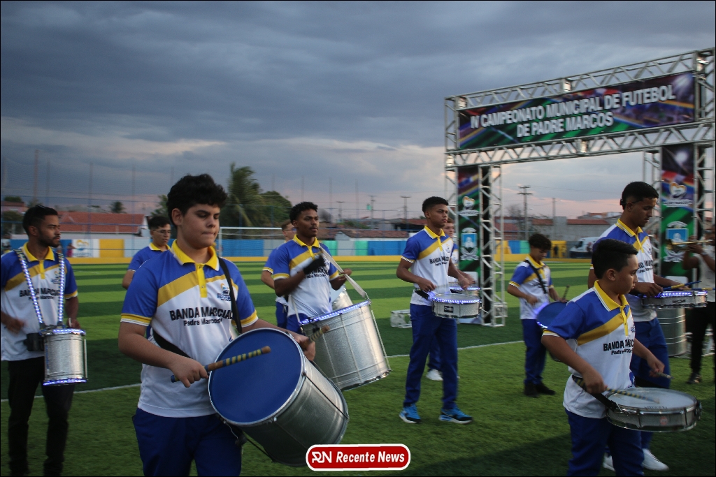 A abertura contou com um momento especial: a belíssima apresentação da Banda Marcial Padre Marcos (B.M.P.M), que encantou o público presente com um espetáculo musical vibrante. Sob a regência do maestro Vinícios Silva, a banda deu início à solenidade com uma performance impecável, marcando com ritmo e emoção o início de mais uma edição do campeonato.