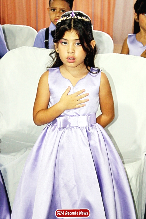 A cerimônia seguiu com a oração conduzida pelo aluno Miguel Araújo Leal, ao som de “Oração de Gratidão”. Logo depois, a aluna Layla Leal Macedo fez o juramento da turma, prometendo estudar com dedicação, respeitar colegas e professores e continuar aprendendo com amor.