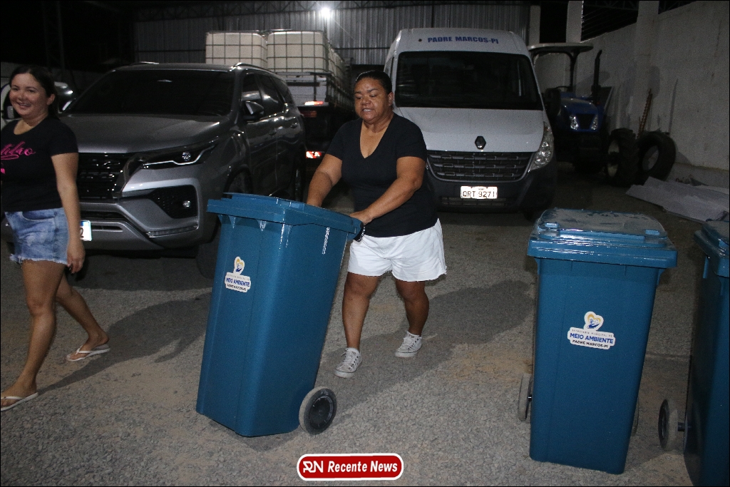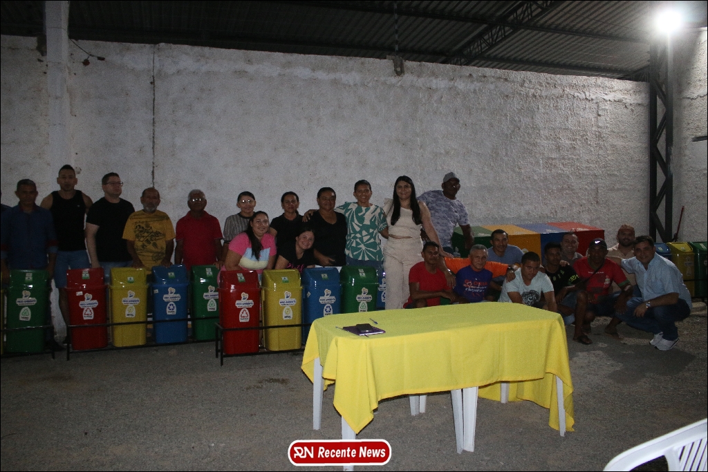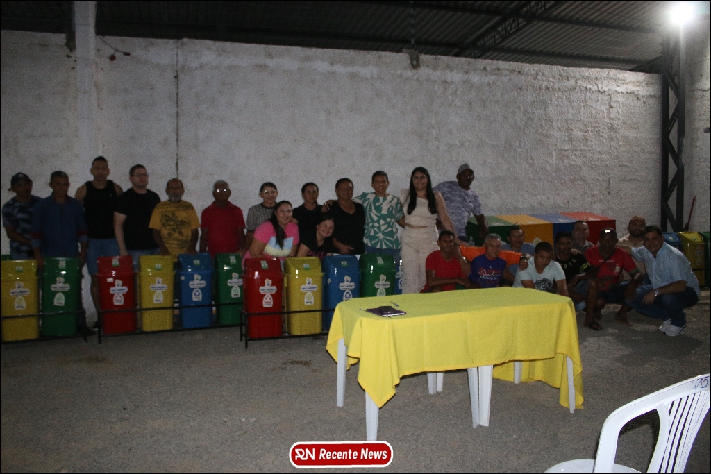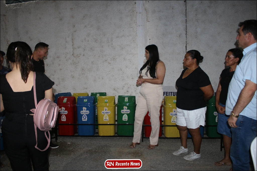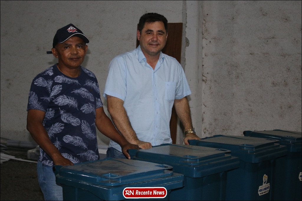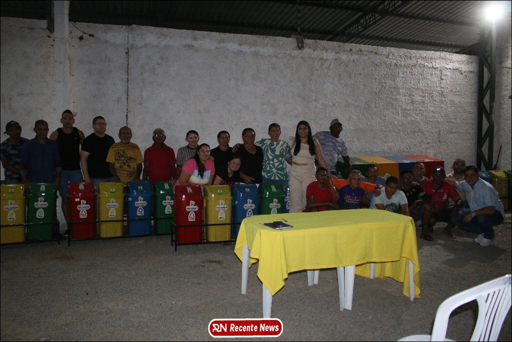 Um dos pontos altos da noite foi a entrega de novas lixeiras — como as que aparecem na imagem do evento — para auxiliar os garis em suas atividades e incentivar a prática da coleta seletiva no município. A medida reforça o compromisso da gestão municipal com a preservação ambiental e o destino correto do lixo.