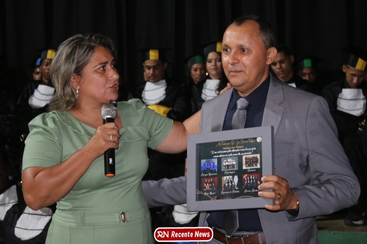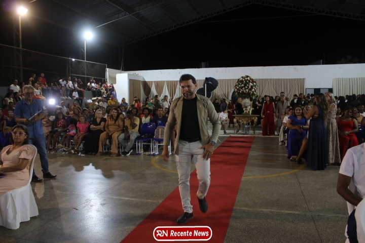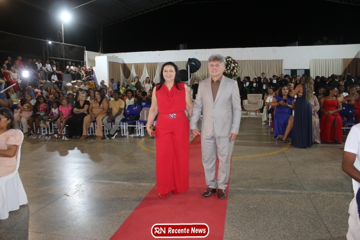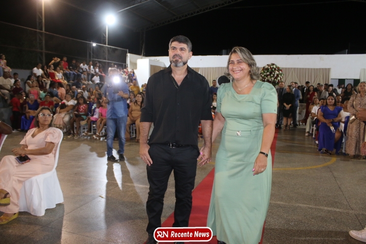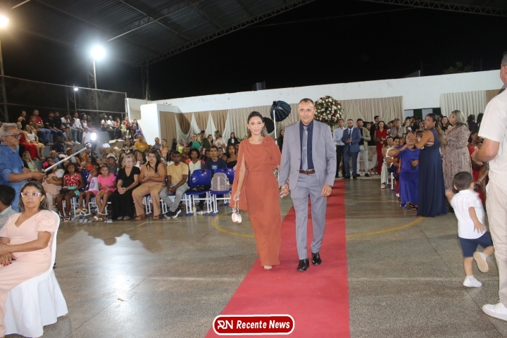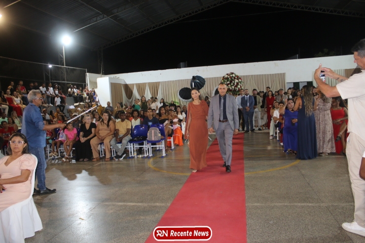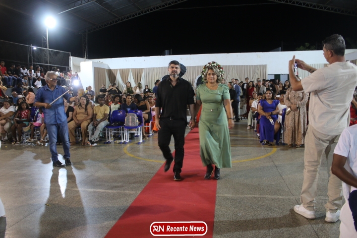 Em um momento de destaque da solenidade, o empresário João Batista Ribeiro, conhecido popularmente como Profeta, foi homenageado como Patrono das Turmas 2025, ao lado de sua esposa, Maria Sandra da Silva Ribeiro, que também recebeu reconhecimento durante a cerimônia. A escolha simbolizou o agradecimento da comunidade escolar pelo apoio, incentivo e presença marcante junto às ações educacionais e sociais, reforçando a importância da parceria entre a escola e a sociedade.