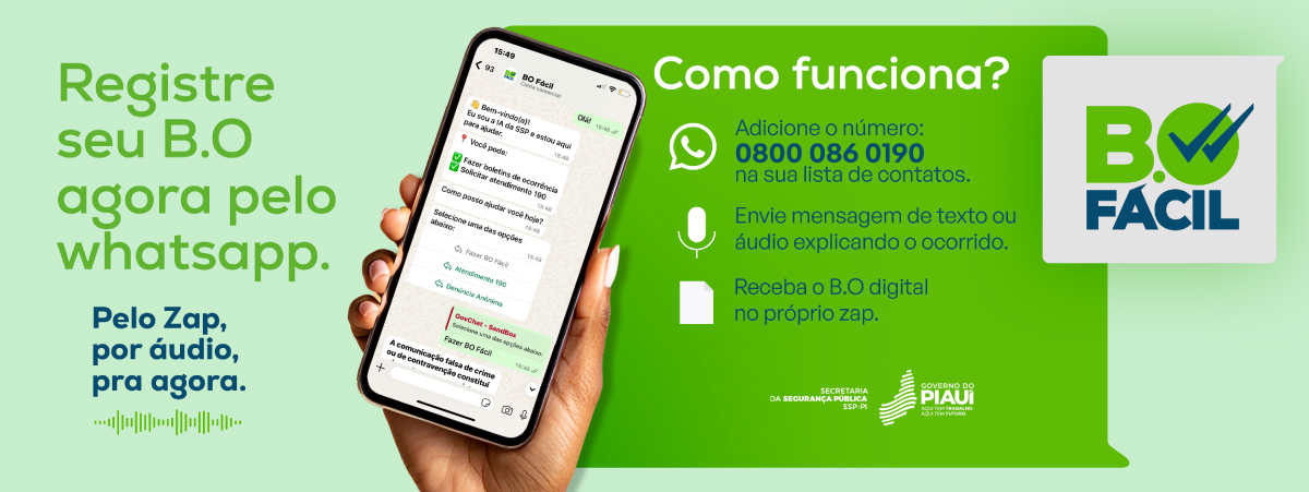 “Mais uma vez, o Piauí sai na frente. Somos o primeiro estado do Brasil a oferecer o registro de boletim de ocorrência via WhatsApp, de forma automatizada, simples e acessível para todos os piauienses. O BO Fácil é uma resposta concreta à necessidade de modernizar a segurança pública e aproximar o serviço da população. É segurança pública com tecnologia e com o olhar voltado para o cidadão”, explica o secretário de Segurança Pública, Chico Lucas.