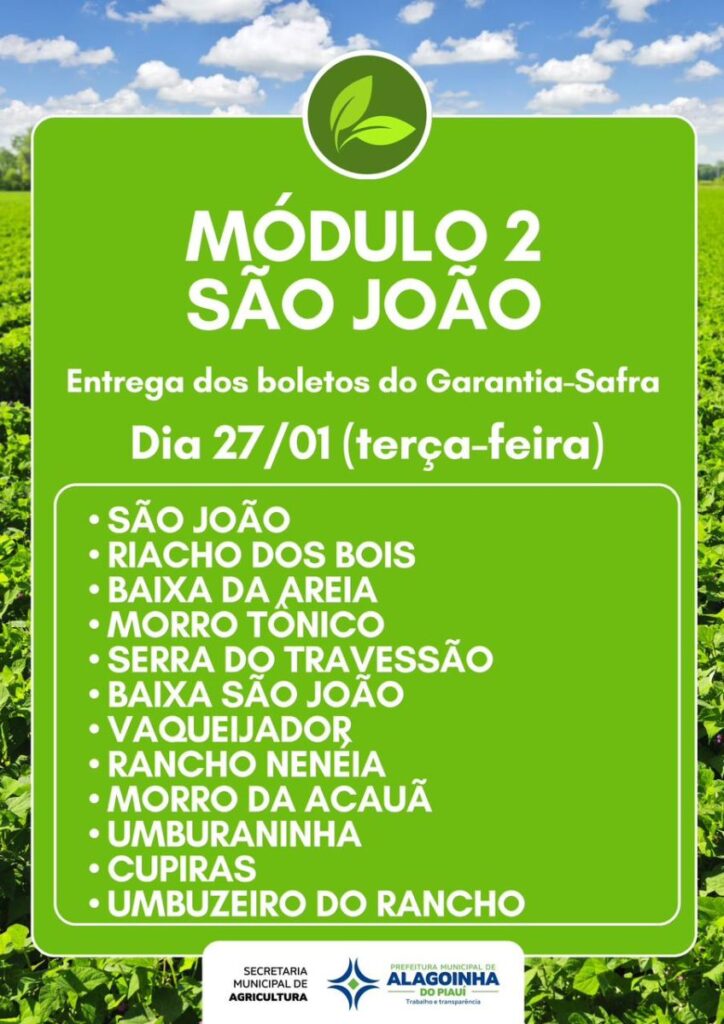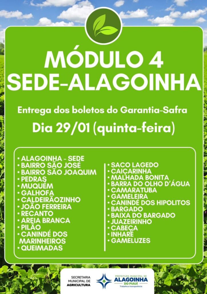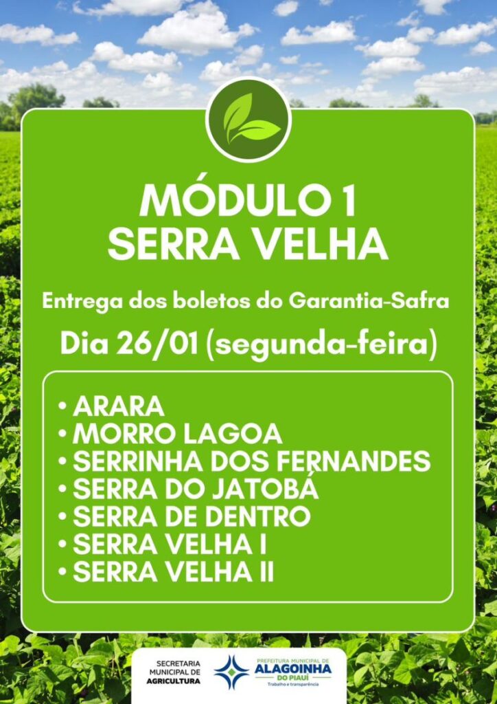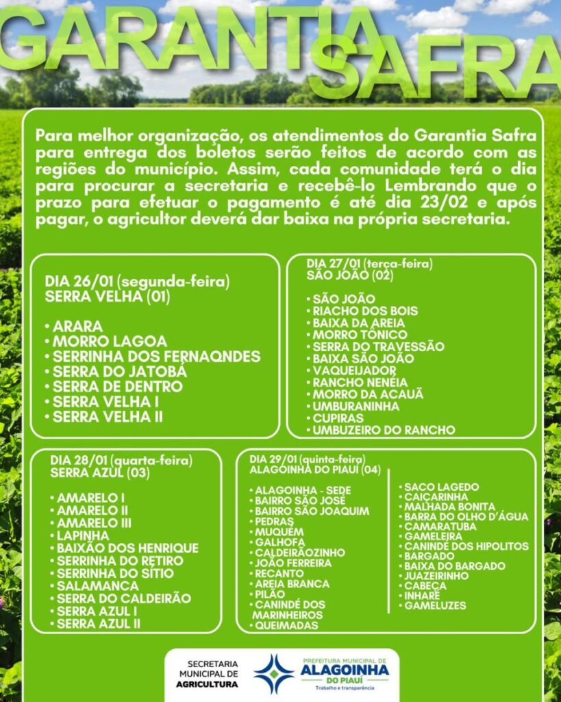A Prefeitura de Alagoinha do Piauí, por meio da Secretaria Municipal de Agricultura, dará início nesta segunda-feira, 26 de janeiro, à entrega dos boletos do Programa Garantia-Safra referente ao ciclo 2025/2026. A ação representa uma etapa fundamental para assegurar a participação dos agricultores familiares no programa, que oferece suporte financeiro em casos de perda significativa da produção agrícola.