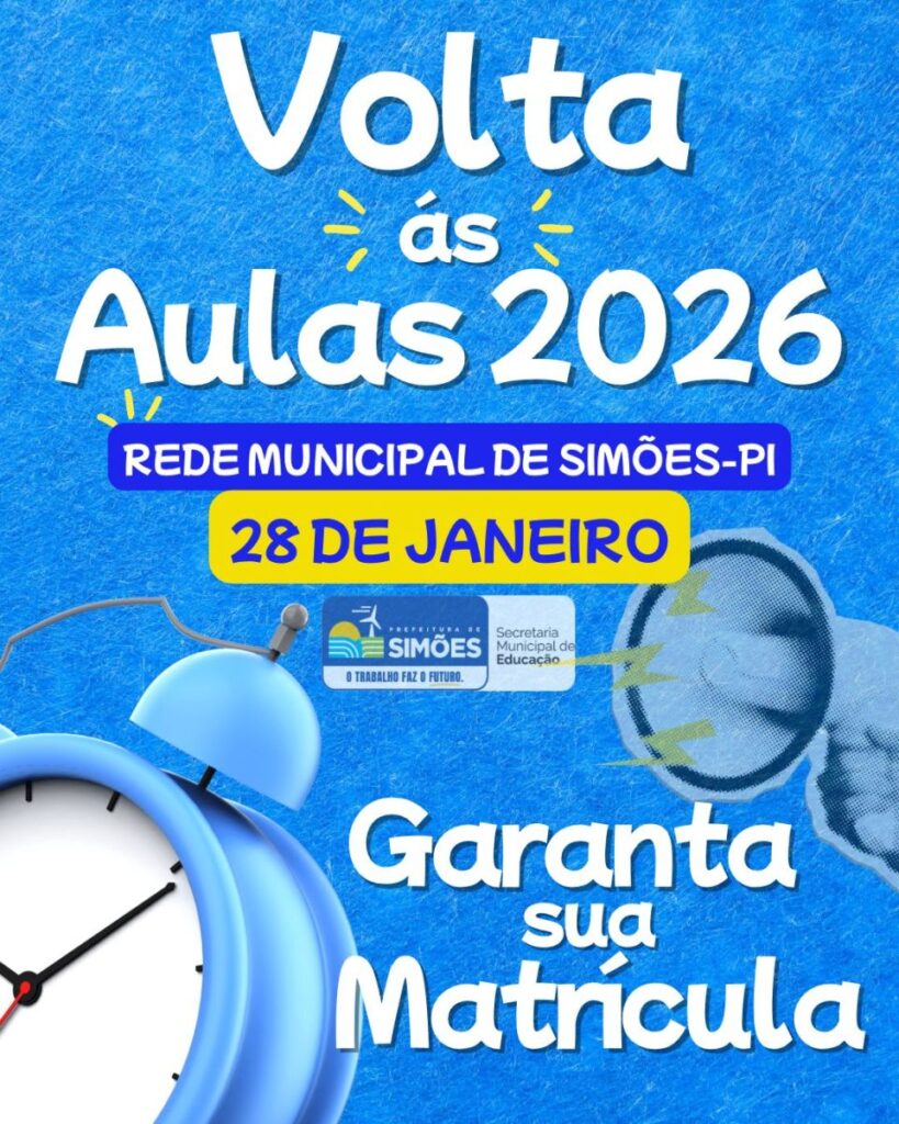 O início do ano letivo está previsto para o dia 28 de janeiro de 2026, data que marcará o retorno das atividades escolares em Simões. A gestão municipal reforça o compromisso com a educação e convida a comunidade a participar ativamente desse processo, assegurando o direito à educação e a continuidade da formação dos estudantes do município.