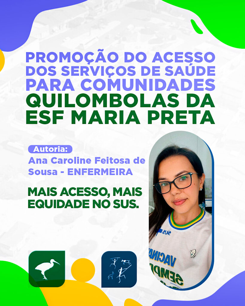• “Promoção do acesso dos serviços de saúde para comunidades quilombolas da ESF Maria Preta”, de autoria de Ana Caroline Feitosa de Sousa;
