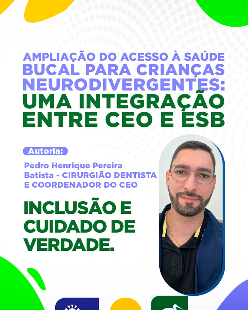 • “Ampliação do acesso à saúde bucal para crianças neurodivergentes: uma integração entre CEO e ESB”, de autoria de Pedro Henrique Pereira Batista;